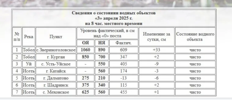 При этом на реке Уй в Усть-Уйском (Целинный округ), а также на Исети у Катайска и Далматово зафиксировано снижение уровня воды — от 3 до 9 сантиметров. Все водные объекты остаются в пределах нормы, состояние рек оценивается как «чисто».
