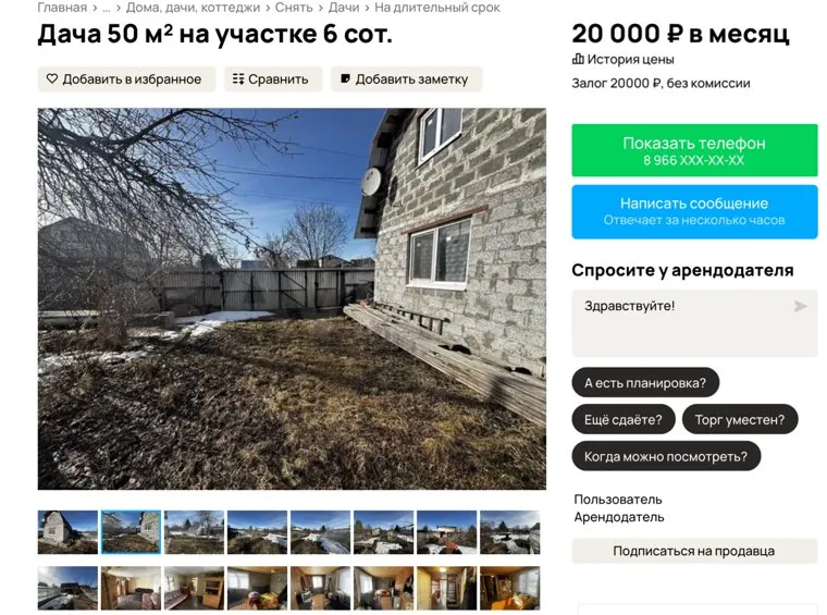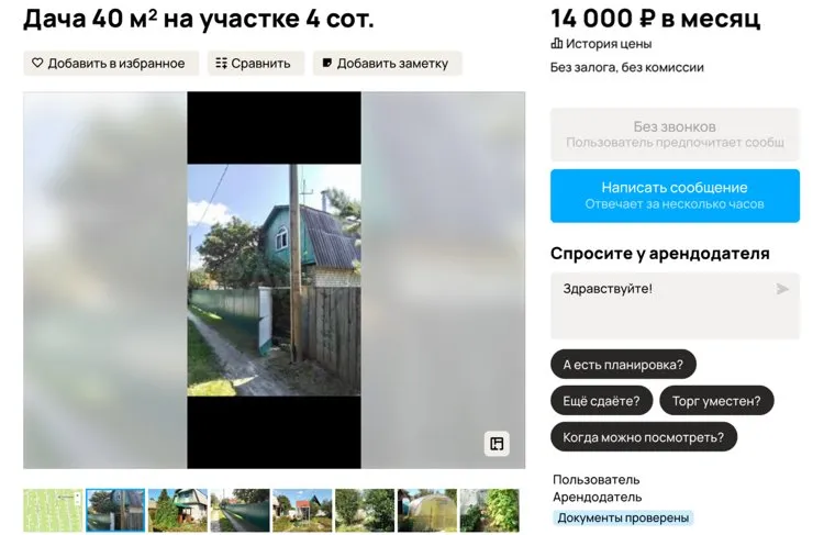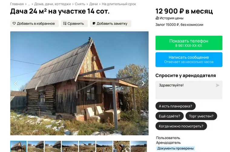 «Дача на участке 14 квадратных мастеров. Площадь дома — 24 квадратных метра. Цена в месяц — 12 900 рублей. Сдам в аренду на длительный срок»,— указано в объявлении.