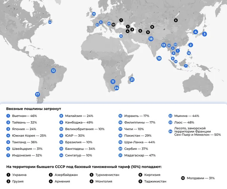 Ранее США объявили о введении таможенных тарифов на продукцию из 185 стран. Установленные ставки пошлин соответствуют половине от тех тарифов, которые эти страны ввели на американские товары, и основываются на принципе взаимности. В список стран, на которые распространяются новые ограничения, не вошли Россия и Белоруссия.