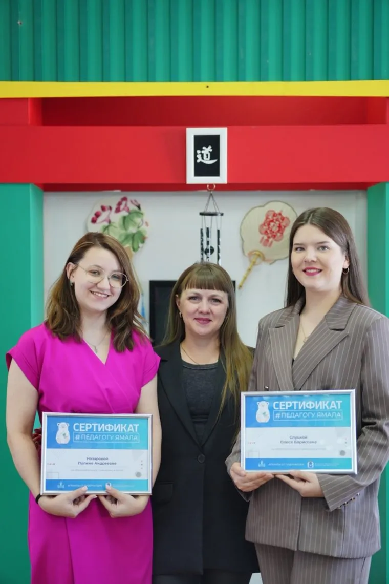 «Сегодня на заключительном этапе Олимпиады школьников „Восточный вектор“ была проведена церемония вручения сертификатов на образовательную стажировку в Китай. Сертификаты получили учителя английского языка Полина Андреевна Назарова и Олеся Борисовна Слуцкая», — рассказали в группе гимназии во ВКонтакте.