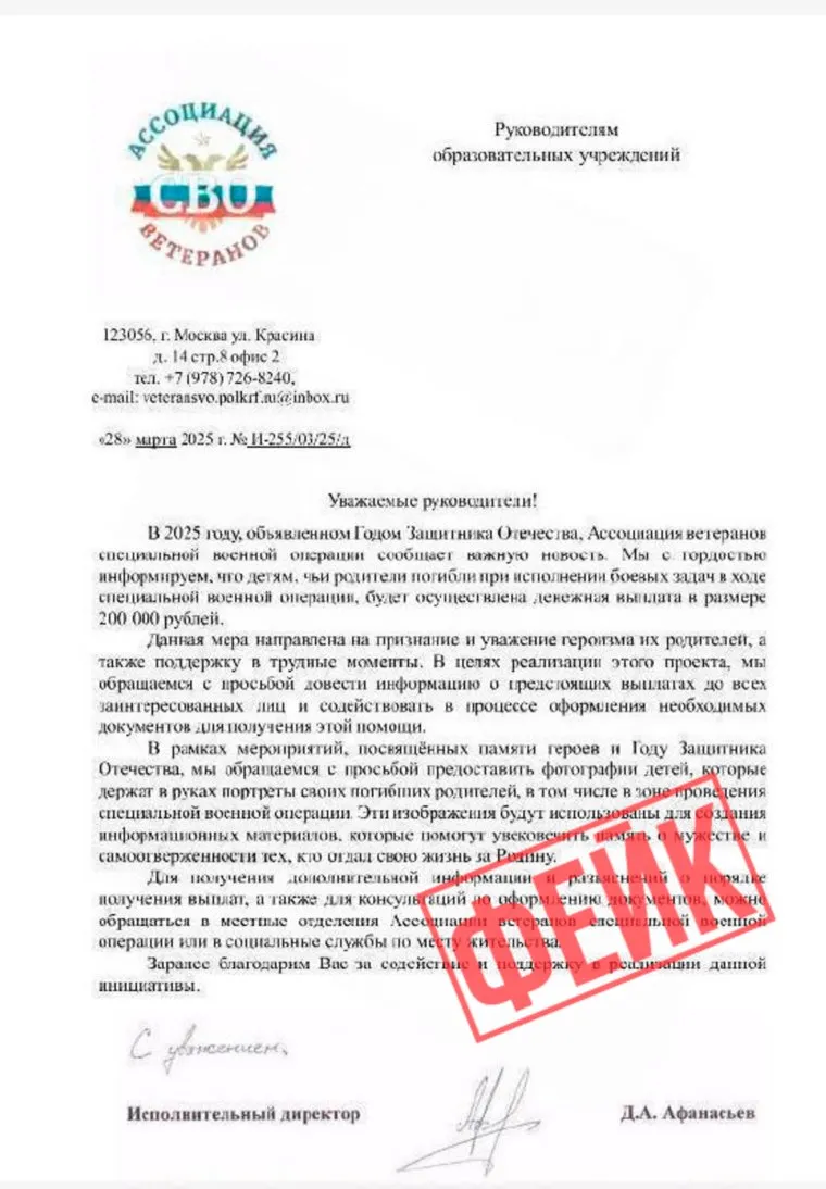 «Под видом информирования о мерах поддержки распространяется фишинговое письмо (мошенническое) с целью выкрасть данные: призывают прислать на поддельный электронный адрес фотографии детей с родителями, погибших в зоне проведения СВО. В этом и заключается опасность! Мошенники используют поддельный бланк официального письма, включая общеизвестные логотип и адрес, чтобы завладеть персональными данными», — предупредили в официальном telegram-канале Ассоциации ветеранов СВО.