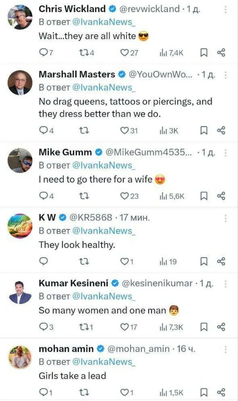 «Это Россия. На что вы обратили внимание?» — написала Трамп, вероятно, отмечая, что в кадре практически одни девушки. Пост набрал 364 тысячи просмотров и более четырех тысяч отметок «нравится».