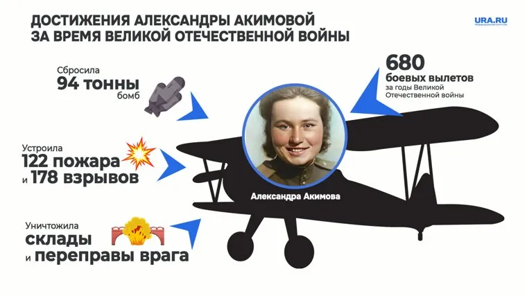 К маю 1945 года 22-летняя Александра Акимова стала командиром полка. Ее представили к званию Героя Советского Союза с формулировкой: «Летает исключительно смело, не страшась ни прожекторов, ни зенитного огня противника». За годы войны она совершила 680 вылетов, сбросила 94 тонны бомб, вызвала 122 очага пожаров и 178 взрывов, уничтожила склады и переправы врага. Однако награда нашла ее лишь в 1994 году, уже как Героя Российской Федерации, благодаря ходатайству ветеранов.