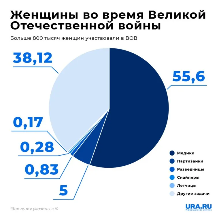 По данным Министерства обороны России, за годы военных действий из 34,5 миллионов мобилизованных советских граждан 490 235 составляли женщины. Самое большое количество женщин, 177 065 человек, служило в подразделениях противовоздушной обороны. Существовал также корпус женского подразделения, где все должности, от командиров до поваров и водителей, занимали комсомолки. Подробнее о жизни и подвигах героинь Великой Отечественной войны — в материале URA.RU.