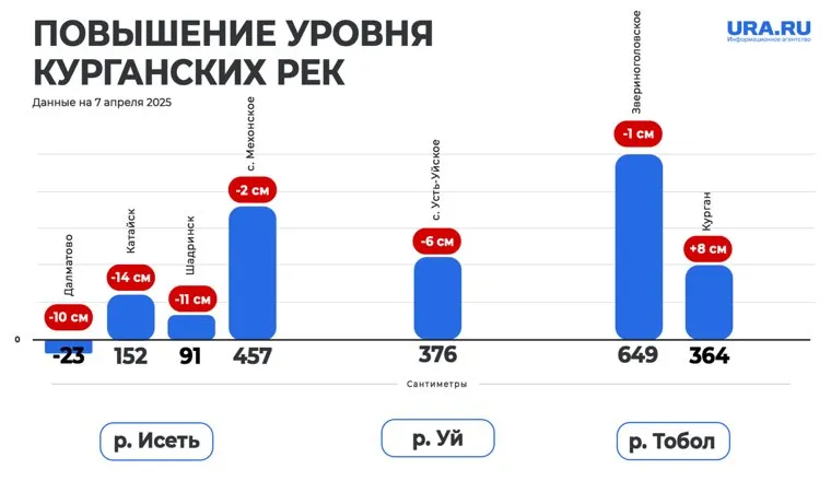 «По данным на 7 апреля, в Звериноголовском уровень воды опустился на 1 сантиметр и достиг отметки в 649. Уровень воды на реке Исеть в городе Катайск упал на 14 сантиметров. В Кургане рост был незначительный — всего на 8 сантиметров, и теперь уровень воды составляет 364 сантиметров», — пишет на своем сайте ЦГМС.