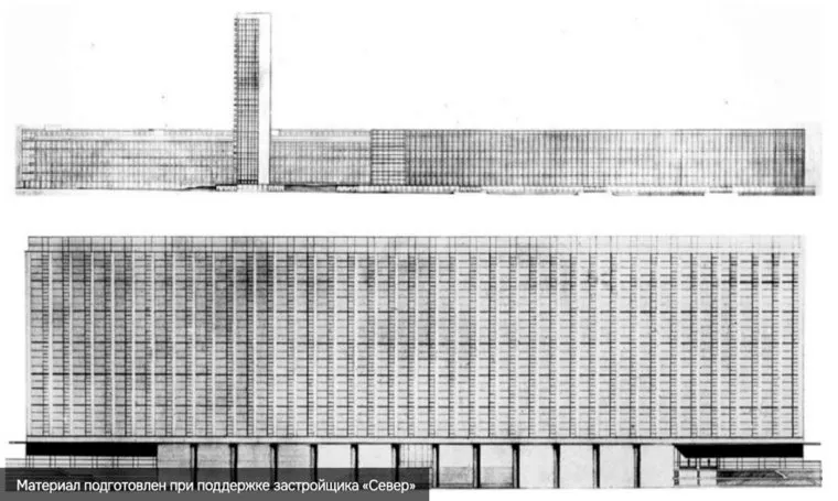 После того как план архитекторов одобрили, эскизы все равно переделывали дважды. В результате получилось П-образное здание с автономно стоящей башней. Объект планировали сделать трехсекционным: первая секция — в один и два этажа для выставки и зала собраний, вторая секция — семиэтажное здание для трестов и Госбанка, третья — с 15-ю этажами для проектных контор.