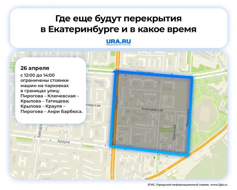 Парковки в границах улиц Пирогова — Ключевская — Крылова — Татищева и Крылова — Крауля — Пирогова — Анри Барбюса закроют с 12:00 26 апреля до 14:30 27-го числа.