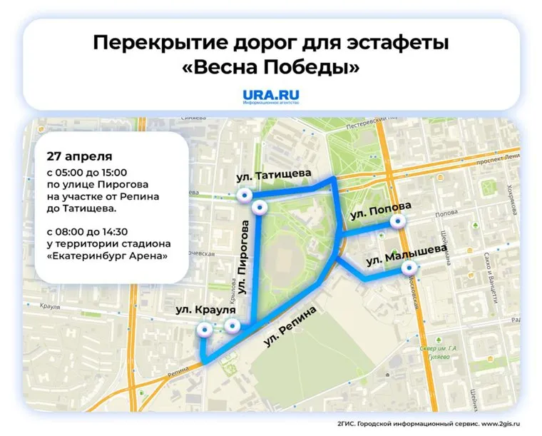 Кроме этого, с 12:00 26 апреля до 14:30 27 апреля будут ограничены стоянки автотранспорта на парковках в границах улиц: Пирогова — Ключевская — Крылова — Татищева; Крылова — Крауля — Пирогова — Анри Барбюса. Алкоголь не получится купить в границах улиц Репина — Крауля — Татищева в день эстафеты с 08:00 до 14:00.