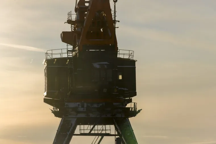 Вид на портальные краны и берег Обского причала в Лабытнанги
