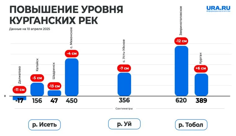 «По данным на 10 апреля, в Звериноголовском уровень воды опустился на 12 сантиметров и достиг отметки в 620. Уровень воды на реке Исеть в городе Шадринск упал на 13 сантиметров. В Кургане подъем на 6 сантиметров, и теперь уровень воды составляет 389 сантиметра», — пишет на своем сайте ЦГМС. Кроме того, на реке Уй в Усть-Уйском (Целинный округ) и на реке Исеть у города Далматово зафиксировано снижение уровня воды на 7 и 11 сантиметров соответственно.
