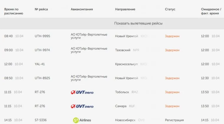 Как следует из данных онлайн-табло аэропорта Нового Уренгоя, Авиакомпания Ютэйр — Вертолетные услуги задержала до 11:00 внутренние вылеты по городу и в Тазовский — до 12:00. Время задержки составляет два часа.