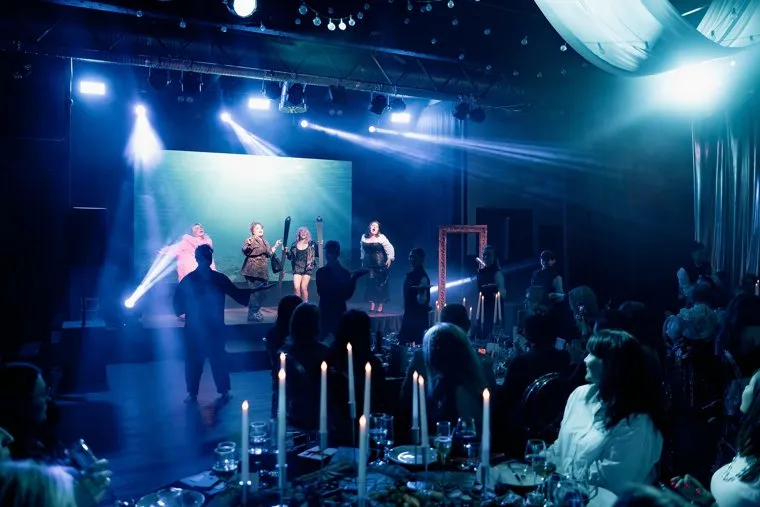 Сначала гости попадают в украшенный зал, где их ждет фотозона и welcome-зона. В это время идет перформанс, погружающий в необычный вечер: звучит живая музыка, а посетителей встречает актриса в роли некой хозяйки ужина. После третьего звонка начинается полноценное действие. Еще одна фишка формата кроется в иммерсивности, то есть, происходящее выходит за рамки сцены.