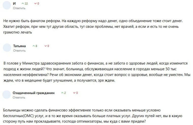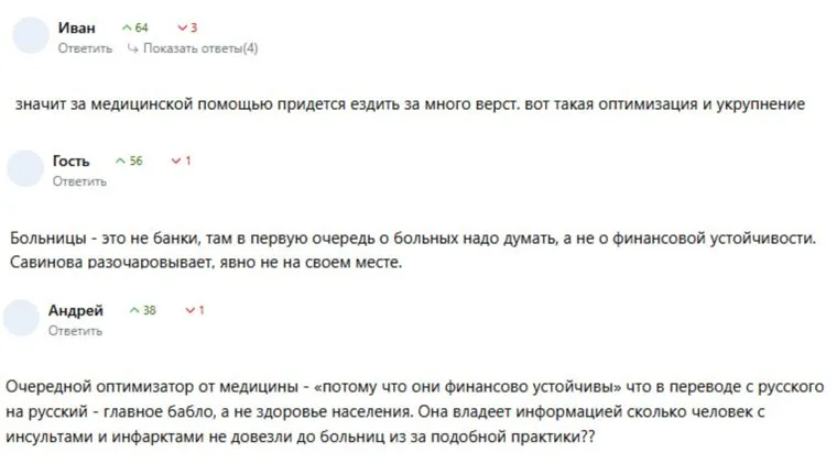 «Что значит больница неэффективна? — написала в комментариях читательница „Татьяна“. — Вопрос об экономии денег, когда стоит вопрос о здоровье, вообще неуместен. Мы ждем, что в медицине будет улучшение, а получается, зря ждем».
