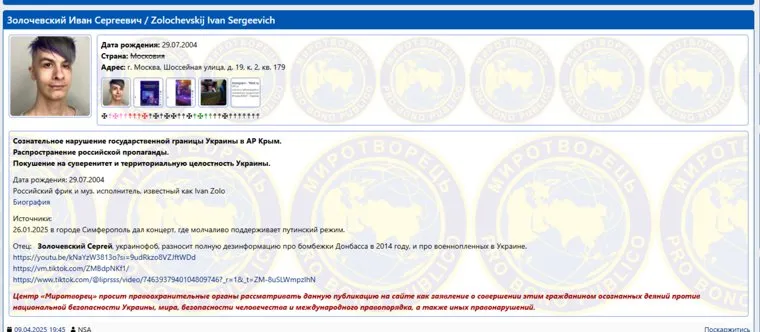 ФИО тиктокра появилось на сайте «Миротворца». «Распространение российской пропаганды. Покушение на суверенитет и территориальную целостность Украины» — говорится в профиле Золо. Там также отметили, что он провел концерт в Симферополе, где поддержал РФ.