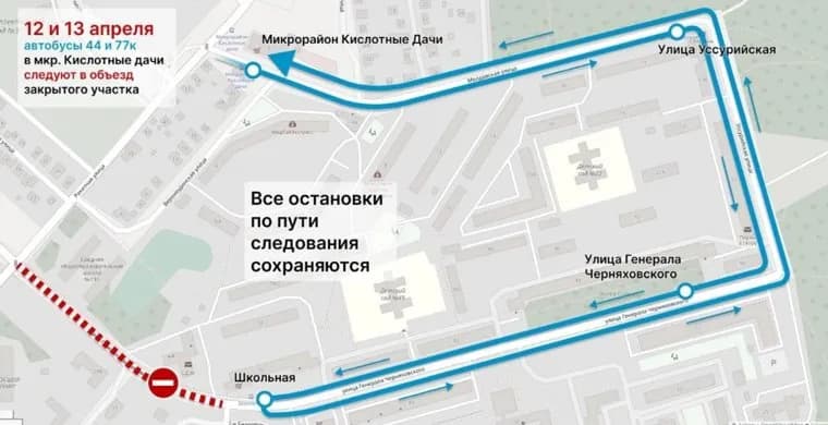 «С 23:00 11 апреля до 07:00 14 апреля из-за аварийных работ изменится движение автобусов №44 и №77к в микрорайоне Кислотные дачи. Автобусы следуют до остановки „Школьная“, обратно до остановки „Микрорайон Кислотные дачи“ и далее по маршруту. Все остановки сохранятся», — говорится в telegram-канале дептранса Перми.