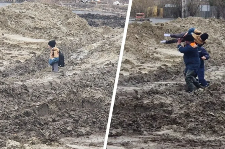 «Пришлось доставать спасателям»: в Тюмени ребенок застрял по колени в грязи на стройке. Фото