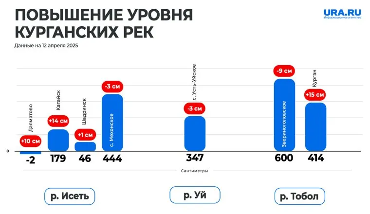 «Вода в Тоболе у Кургана поднялась на 15 сантиметров, на 12 апреля уровень воды составляет 414 сантиметров. У села Звериноголовское уровень воды в Тоболе снизился на девять сантиметров», — сообщается на сайте Курганского ЦГМС.