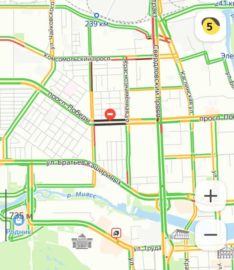 «Дублерами проспекта Победы является Комсомольский проспект и улица Братьев Кашириных. На Комсомольском проспекте заторы сразу в нескольких местах. По улице Братьев Кашириных движение рабочее», — говорится в данных сервиса.