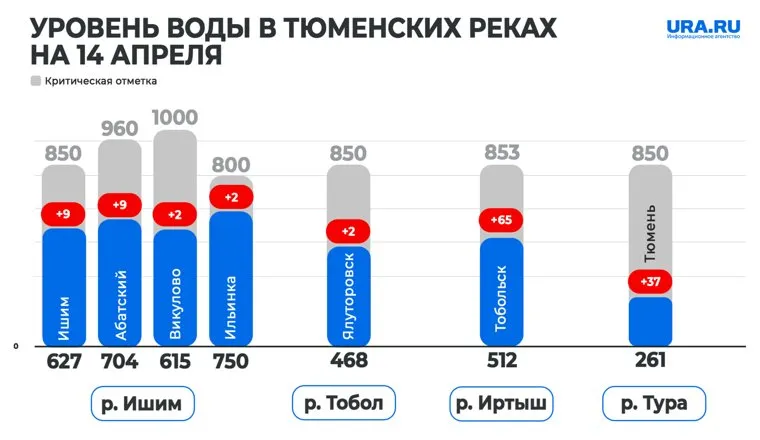 «Название гидропоста: Иртыш — Тобольск. Уровень воды над нулем поста 512 см. Изменение уровня воды за сутки +65 см. Гидропост Тура — Тюмень, уровень воды — 261 см, изменения за сутки +37 см», — указано на сайте сервиса.