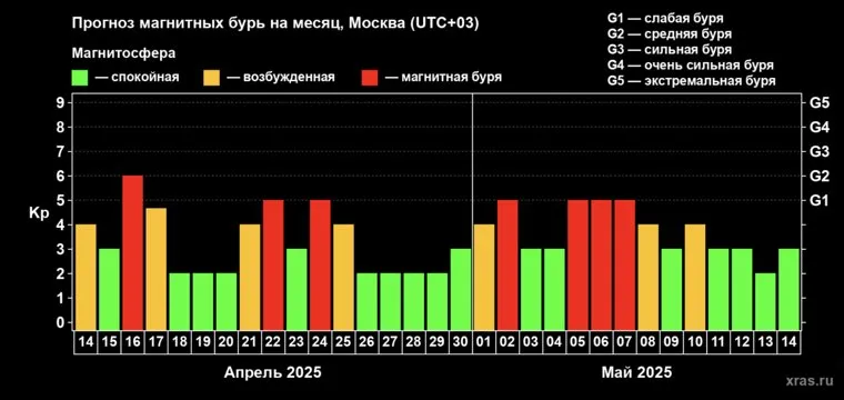 После сильной геомагнитной активности 16 апреля ученые прогнозируют еще несколько магнитных бурь в течение месяца. Активность магнитосферы Земли поднимется до «красных» значений 22 и 24 апреля, а также 2, 5, 6 и 7 мая. В остальные дни ученые прогнозируют спокойную геомагнитную обстановку. Однако все может измениться буквально за несколько дней, поэтому метеозависимым людям лучше проверять прогноз на ближайшие сутки.