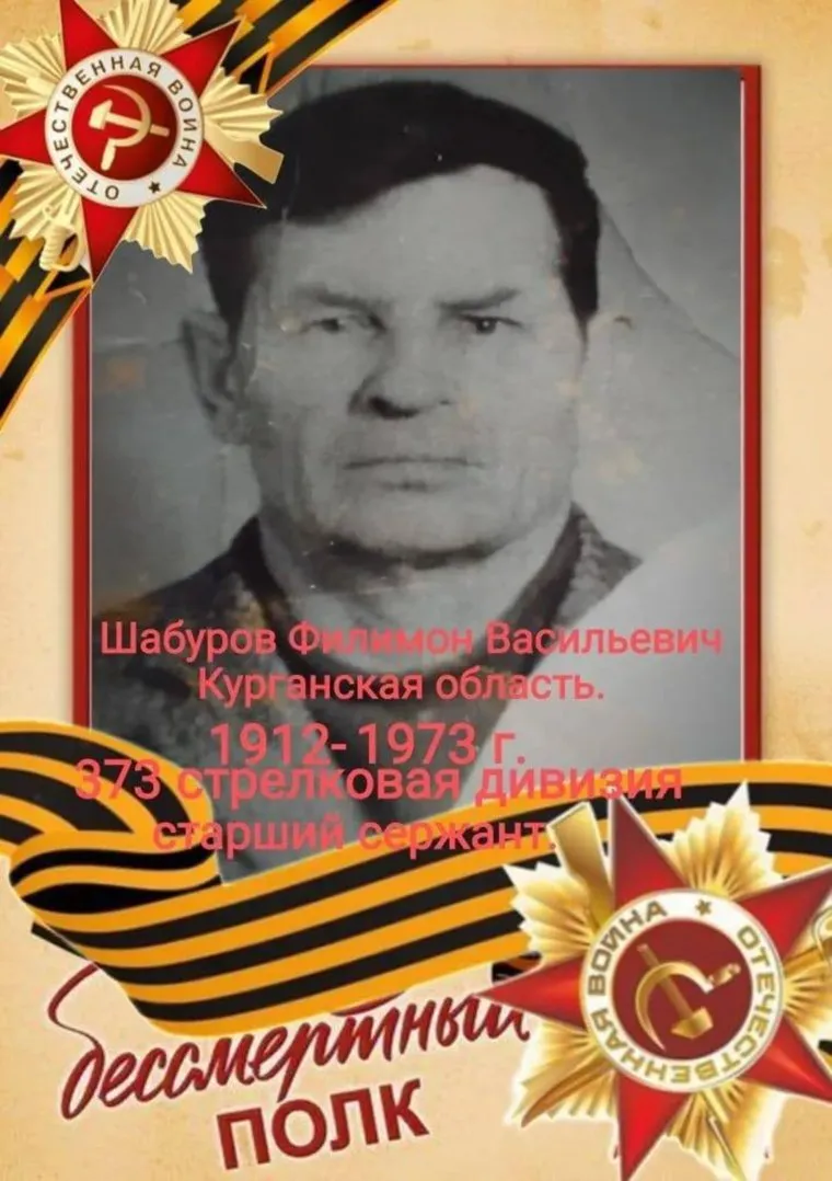 Дедушка журналиста URA.RU Екатерины Сычковой Филимон Шабуров сыграл значительную роль в Великой Отечественной войне. Шабуров родился в 1912 году в Варгашинском районе Курганской области. Был призван на службу 27 января 1942 года. Шабуров служил в различных воинских частях, включая 373-ю стрелковую дивизию и 373-й отдельный артиллерийский дивизион.