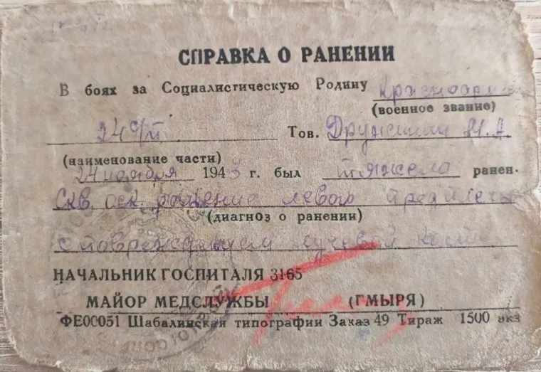 «Оба моих деда принимали участие в войне. Ушли они на фронт в 17-18 лет. Первый по матери — Дружинин Михаил Александрович — прослужил недолго. Был призван Юргамышским райвоенкоматом. Участвовал в боевых действиях в составе 64-го гвардейского стрелкового полка с января по октябрь 1943 года. Бои шли в районе Великих Лук, дед был старшим пулеметчиком. Осенью дед получил сквозное осколочное ранение предплечья», — рассказал внук ветерана журналист URA.RU Валерий Кузнецов.