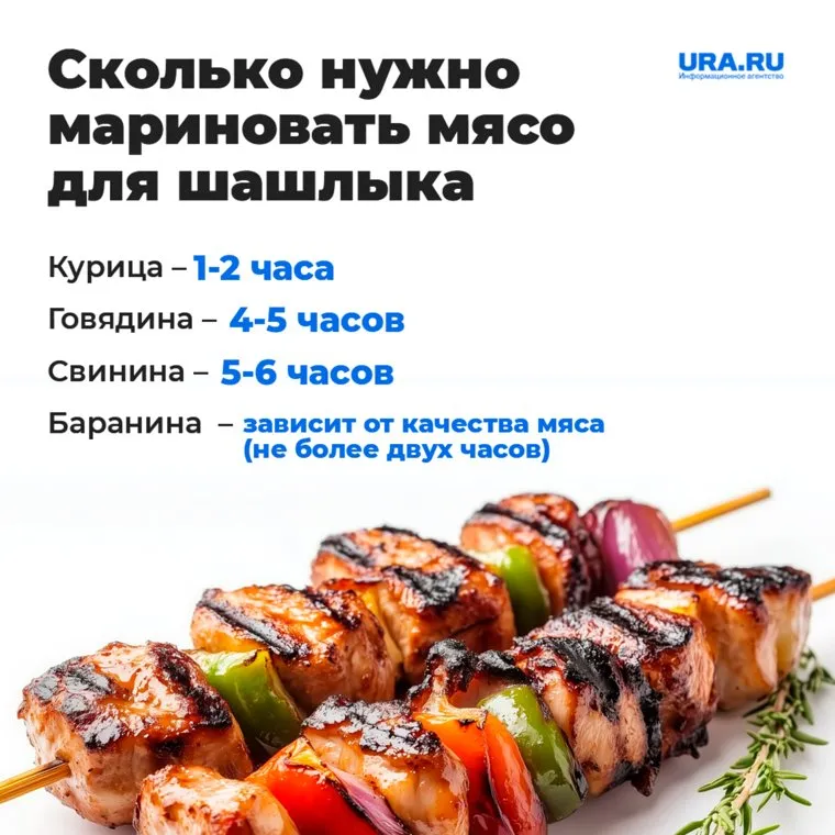 По словам шеф-повара, курице достаточно всего пары часов в маринаде, говядине — 4-5 часов, а свинину лучше оставить на все 5-6 часов. «Про баранину сказать сложнее, потому что это сильно зависит от качества мяса. Если она хорошая, то достаточно перемешать со специями и сразу на огонь. Если похуже, то часа два можно помариновать», — добавил шеф-повар.