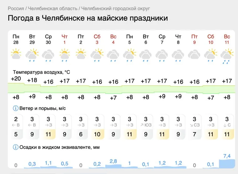 Фото: Скрин с сайта «Гисметео» https://www.gismeteo.ru/weather-chelyabinsk-4565/may-holidays/