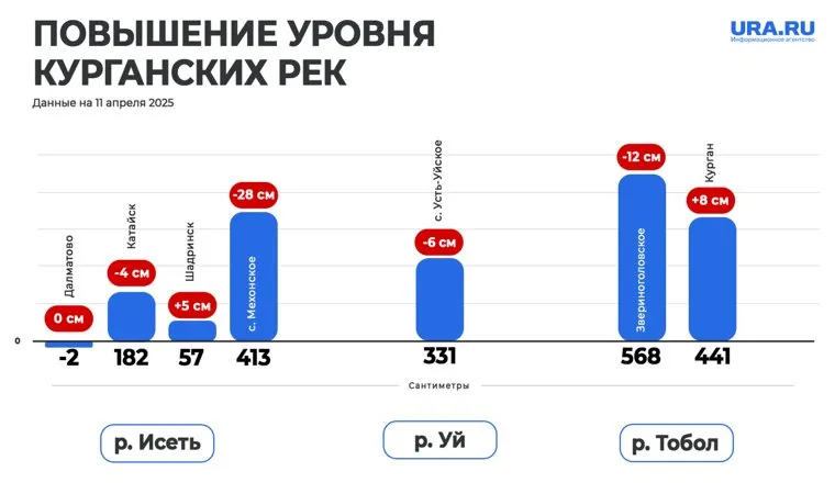 «По данным на 15 апреля, в Звериноголовском уровень воды опустился на 12 сантиметров и достиг отметки в 568. Уровень воды на реке Исеть в городе Шадринск поднялся на 5 сантиметров. На Тоболе В Кургане подъем на 6 сантиметров, и теперь уровень воды составляет 413 сантиметров», — пишет на своем сайте ЦГМС. Кроме того, на реке Уй в Усть-Уйском (Целинный округ) зафиксировано снижение уровня воды на 6 сантиметров.