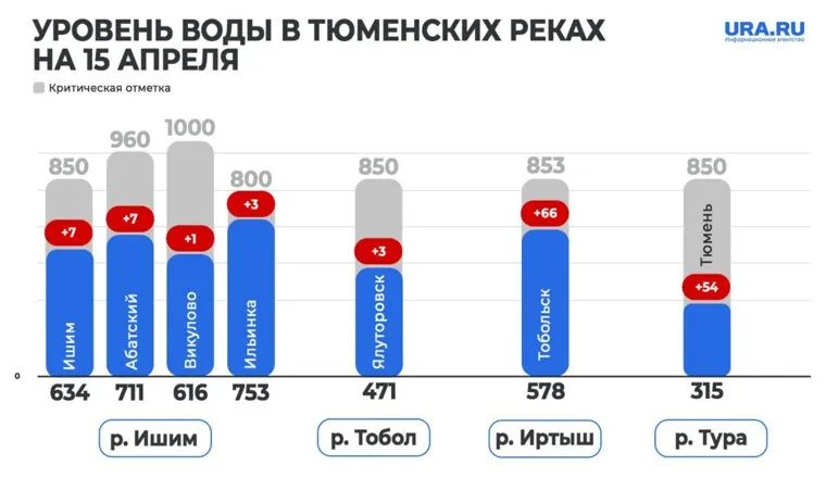 «В отличие от прошлого года, уровень воды растет сдержанно. На 15 апреля 2025 года ситуация на гидропостах следующая: в селе Ильинка за сутки — плюс три сантиметра, общий уровень воды составил 753 см над уровнем поста. Город Ишим — плюс семь сантиметров (общий уровень — 634 см). Село Абатское — также плюс семь (711 см). Село Викулово — плюс один (616 см)», — указано в публикации Александра Моора.