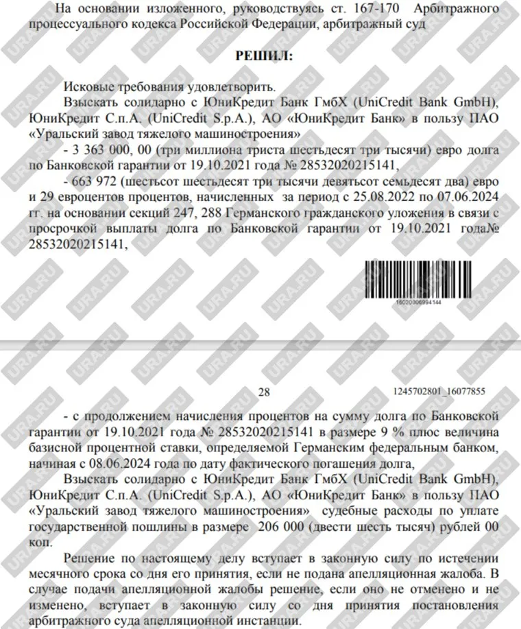 "Исковые требования удовлетворить. Взыскать солидарно с ЮниКредит Банк ГмбХ (UniCredit Bank GmbH), ЮниКредит С.п.А. (UniCredit S.p.A.), АО «ЮниКредит Банк» в пользу ПАО «Уральский завод тяжелого машиностроения» — 3363000 евро долга по банковской гарантии от 19.10.2021 года, — 663972 евро и 29 евроцентов процентов, начисленных за период с 25.08.2022 по 07.06.2024", — говорится в решении суда.
