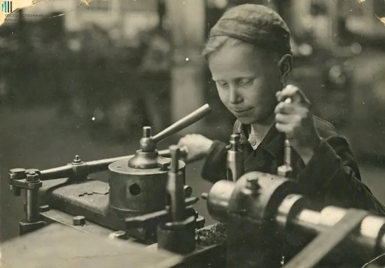 12-летний токарь-фрезеровщик завода №19 имени Сталина Валя Кусакин