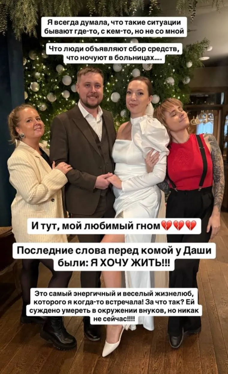 «Даша впала в глубокую кому. Врачи говорили, что будут наблюдать за реакцией мозга 48 часов. Хорошая новость в том, что Даша сегодня себя чувствует лучше, чем вчера. У нее была обнаружена инфекция в крови, ее полностью убрали, убрали воду из легких, нормализовали давление и сердечный ритм стал практически нормальный», — пояснила Комендантова на своей странице в Instagram (принадлежит компании Meta, которая признана экстремистской и запрещена в РФ).