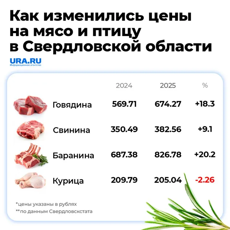 Цены на мясо выросли в Свердловской области за год, наибольший прирост стоимости показала баранина, а курица, наоборот, подешевела. Корреспондент URA.RU сравнил, как изменились цены, опираясь на данные Свердловскстата.