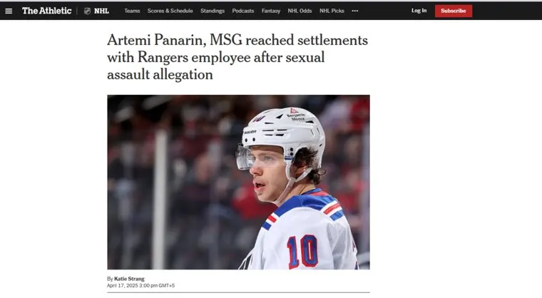 «Нападающий „Нью-Йорк Рейнджерс“ Артемий Панарин и компания Madison Square Garden Sports, которой принадлежит команда, в прошлом году выплатили финансовую компенсацию сотруднице „Рейнджерс“. Так как она заявила, что Панарин совершил в отношении нее сексуальное насилие», — сообщает The Athletic со ссылкой на источник.