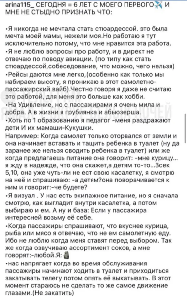 «Хоть по первому образованию я педагог, меня раздражают дети и их мамаши-кукушки. Например, когда самолет только оторвался от земли, и она начинает вставать и тащить ребенка в туалет (ну да, заранее же нельзя сводить ребенка в туалет) или же когда предлагаешь питание, она говорит: „Мне курицу“. Я жду в надежде, что она скажет: „А детям то-то…“. Три секунды, пять, десять, она уже чуть ли не ест свою касалетку, я смотрю на нее и спрашиваю: „А детям? Она поворачивается к ним и говорит: „Че будете?“ — рассказывает о своей работе стюардесса АТК „Ямал“ Арина (стилистика отзыва сохранена). Свои впечатления она опубликовала в Instagram*.