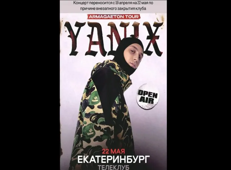 Концерт популярного рэпера Yanix, который должен был пройти в Екатеринбурге 19 апреля в Tele-Club, перенесли на 22 мая. Об этом артист рассказал в своих соцальных сетях.