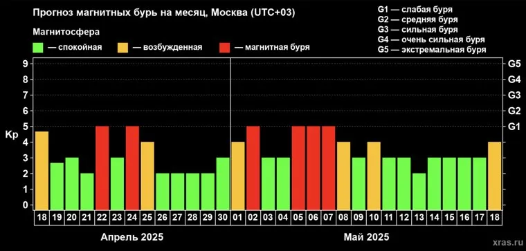 В апреле ученые прогнозируют еще две возможные магнитные бури. Они могут обрушиться на Землю 22 и 24 апреля. Также 25 числа сохраняется риск возбужденности магнитосферы. В начале следующего месяца повышенная геомагнитная активность, с высокой вероятностью, вернется. Магнитные бури ожидаются 2, 5, 6 и 7 числа. Повышенная активность магнитосферы прогнозируется 1, 8, 10 и 18 мая. При этом нужно учитывать то, что обстановка всегда может измениться, поэтому метеозависимым людям стоит проверять прогноз на геомагнитной активности на ближайшие несколько дней.