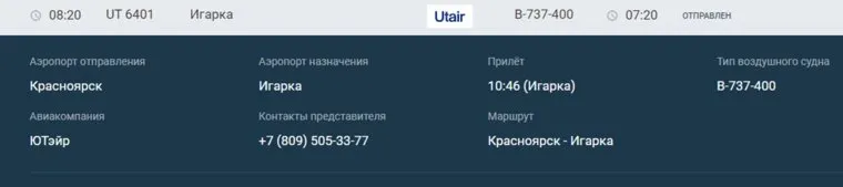 Информация о рейсе подтверждается данными онлайн-табло аэропорта Красноярска. Самолет Utair должен был вылететь 18 апреля в 7:20, но был задержан на час.