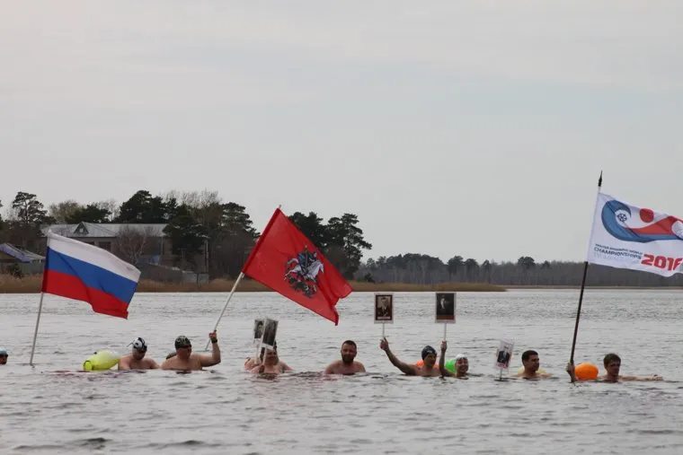 Жители Курганской области плавали в ледяной воде с флагами и портретами ветеранов. Фото