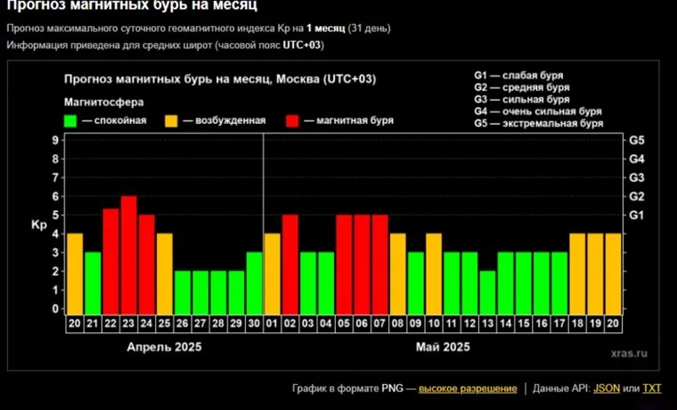 - 25–29 апреля: возвращение спокойствия. После 24 апреля геомагнитная обстановка должна успокоиться. 25–29 апреля прогнозируется низкая активность, что позволит системам восстановиться после бурь.