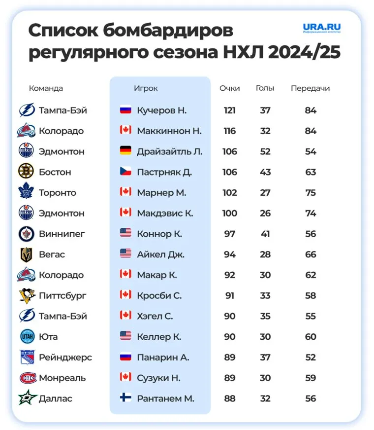 Регулярный чемпионат Национальной хоккейной лиги (НХЛ) 2024/25 завершился 18 апреля. Сезон выдался богатым на события: Александр Овечкин побил казавшийся вечным рекорд Уэйна Гретцки, Никита Кучеров второй год подряд стал лучшим бомбардиром, Андрей Василевский вернулся на пик формы, также ряд российских новичков громко заявил о себе в лиге. Плей-офф Кубка Стэнли уже стартовал первыми матчами, и впереди болельщиков ждет захватывающая борьба за главный трофей. Подробнее о результатах регулярного чемпионата НХЛ, бомбардирах и о плей-офф — в материале URA.RU.