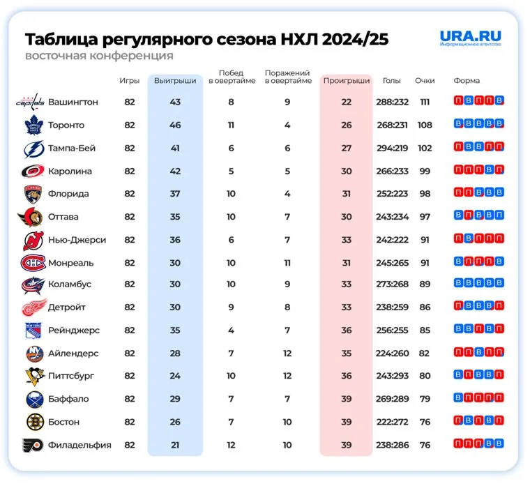 В Восточной конференции интересно выглядит топ-5. После «Вашингтона» (111) идут «Торонто Мэйпл Лифс» (108), «Тампа-Бэй Лайтнинг» (102), «Каролина Харрикейнз» (99) и «Флорида Пантерз» (98).