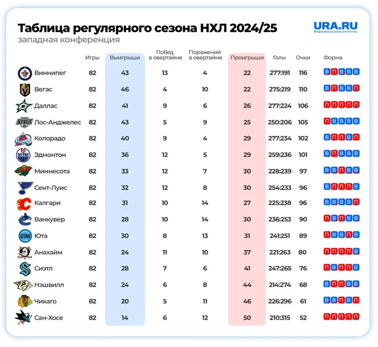 Итоговая таблица западной конференции НХЛ сезона 2024/2025