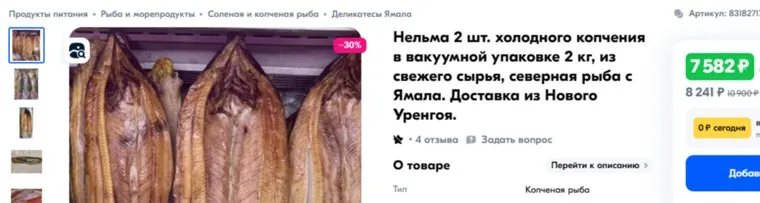 Ямальский бизнес понемногу осваивает розничную торговлю через площадку «Озон». Так, производители рыбных деликатесов предлагают покупателям доставку муксуна и нельмы холодного копчения. Стоимость одной упаковки весом 1,9 кг доходит почти до семи тысяч рублей. Почему цены на ямальскую рыбу стабильно высокие, объясняют продавцы товара.