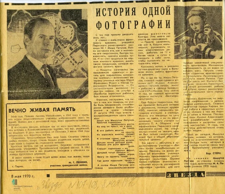 Когда началась война, молотовцу Михаилу Петухову было 12 лет. В 1942 году его класс отправили на медкомиссию, которая признала его «годным для работы в дневную смену». Его направили в ремесленное училище №1 при моторостроительном заводе.