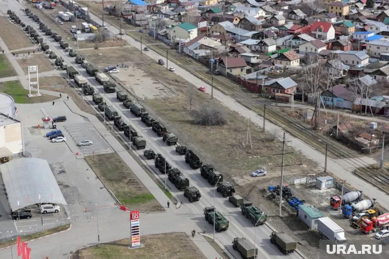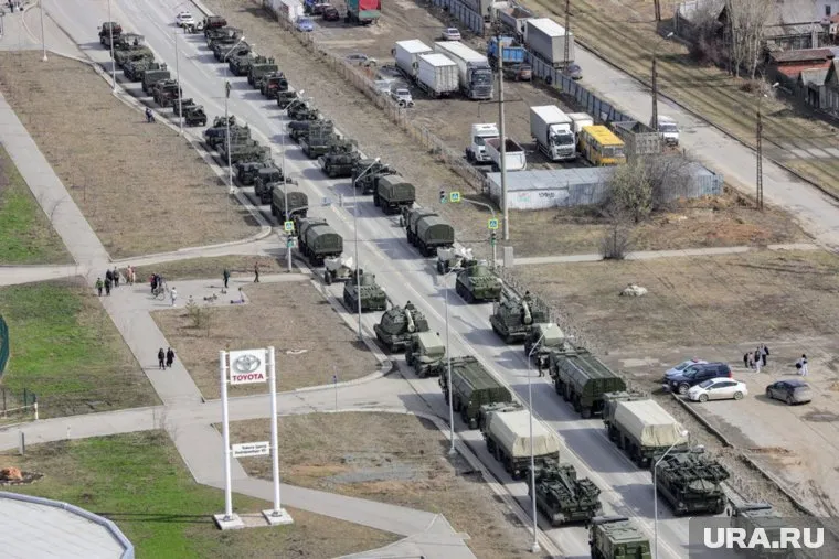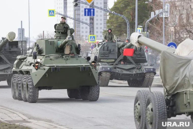 В Екатеринбурге утром 22 апреля несколько улиц в районе Вторчермета перекрыли ради репетиции парада Победы. На дорогу вывели более 60 единиц военной техники и вооруженных солдат, передает корреспондент URA.RU.