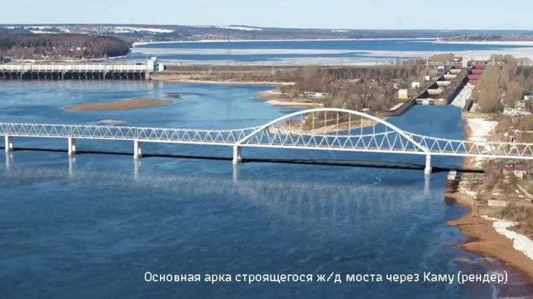 «Пролетное строение полностью соберут на берегу, а на финальном этапе методом продольной „надвижки“ его установят на опоры. В данный момент монтируется специальный стапель, на нем будут собирать арочную конструкцию. Опоры для основной арки установят с левого берега реки. По окончанию работ по продлению струенаправляющей дамбы Камской ГЭС, строители начнут монтаж временного моста для их установки», — сказано на официальном сайте РЖД.