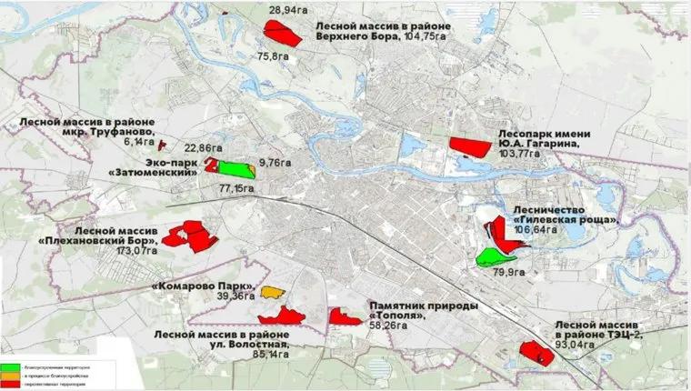 В число перспективных территорий вошли лесные массивы в районе Верхнего Бора, ТЭЦ-2, на улице Волостная, «Плехановский Бор» и в микрорайоне Труфаново. Также в этом списке лесопарк имени Гагарина, лесничество «Гилевская роща», памятник природы «Тополя», «Комарово Парк» и часть эко-парка «Затюменский».