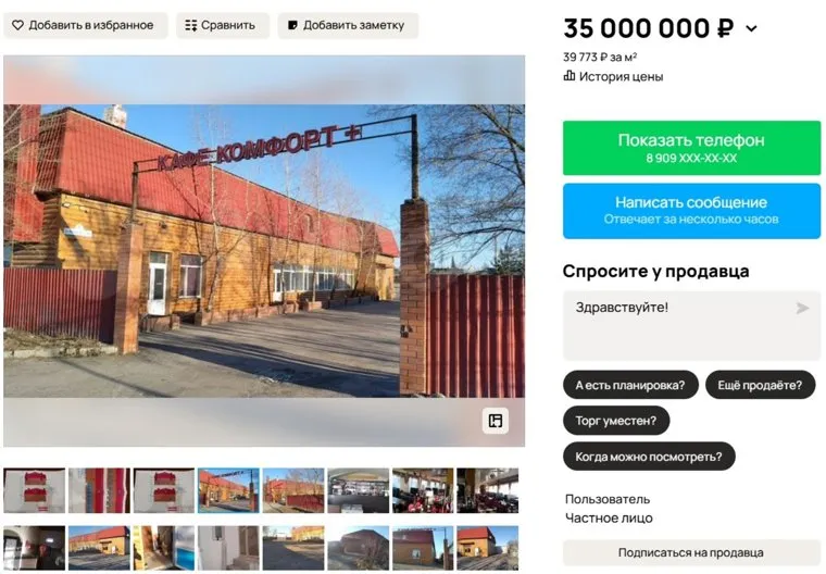 «Продаю кафе „Комфорт“. В здании первый этаж оборудован, кафе действует и процветает. На втором этаже в плане гостиница, ремонт выполнен на 70 процентов, есть разрешение на строительство», — сообщается в объявлении на сайте «Авито». В связи с чем продается процветающее кафе, собственник не уточняет.